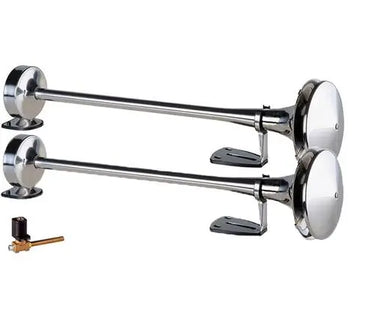 Kompletny zestaw dwóch klaksonów pneumatycznych TRUCK POWER TA150 i TA180 z elektrozaworem FIAMM 24V oraz akcesoriami montażowymi (stal nierdzewna, długość 62 i 53 cm, z osłonami)