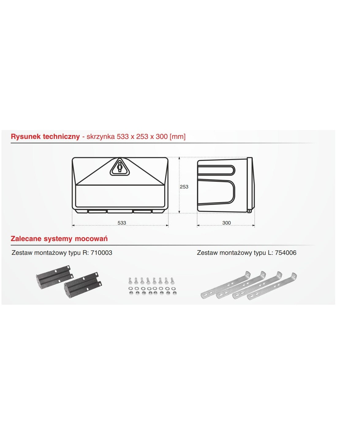 Stabilo Slick-Box 4 Werkzeugkasten. Außenmaße: 533 x 253 x 300 mm. Für kleinere Transporter konzipiert. Griff mit Dreipunktverriegelung. Verstärkte Innenverriegelung. Stahlscharniere. Dichtung. Material: Polyethylen + Stahlelemente. Produktdatenblatt: Montagesatz separat erhältlich. EAN: 5907553550561