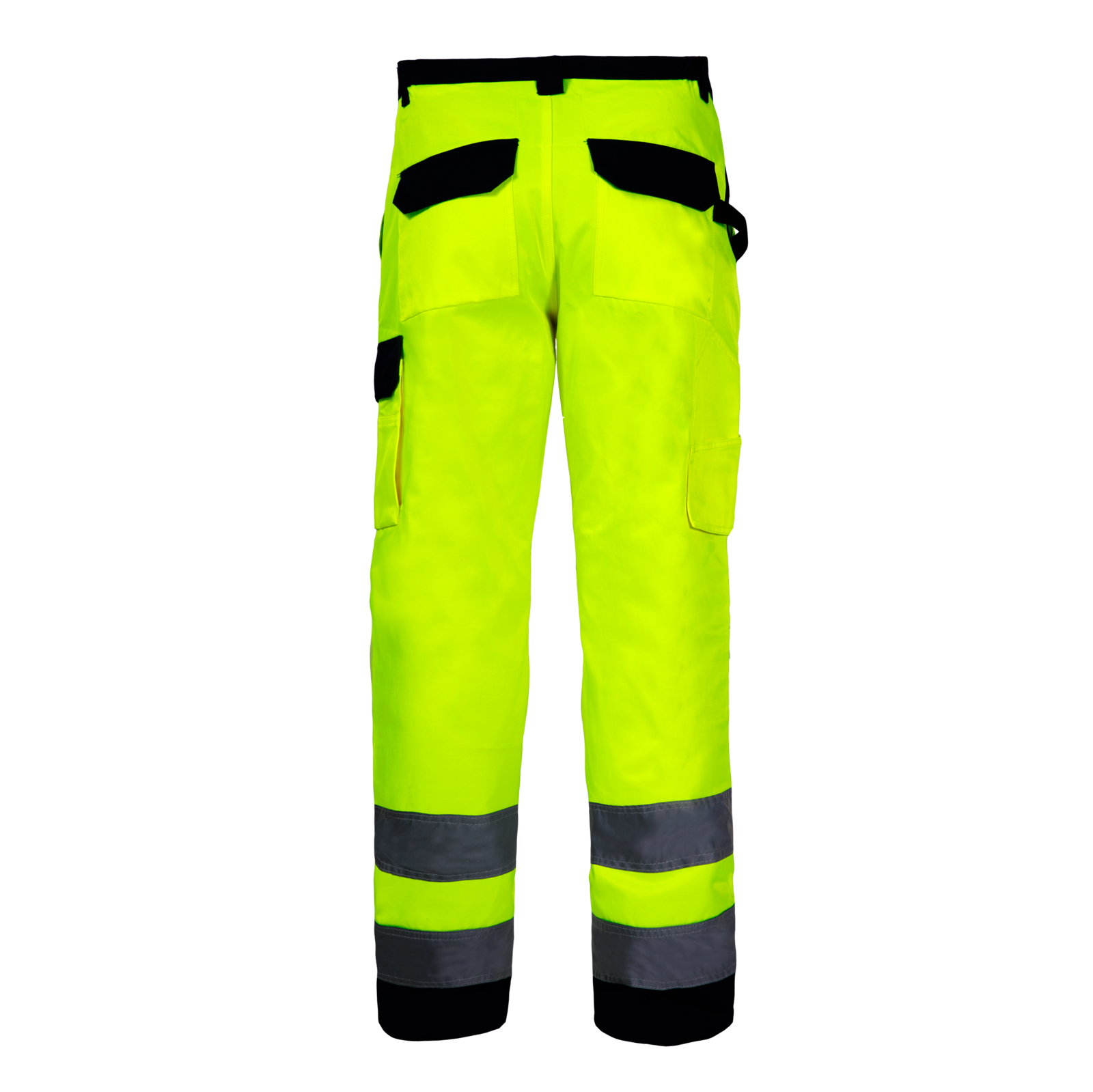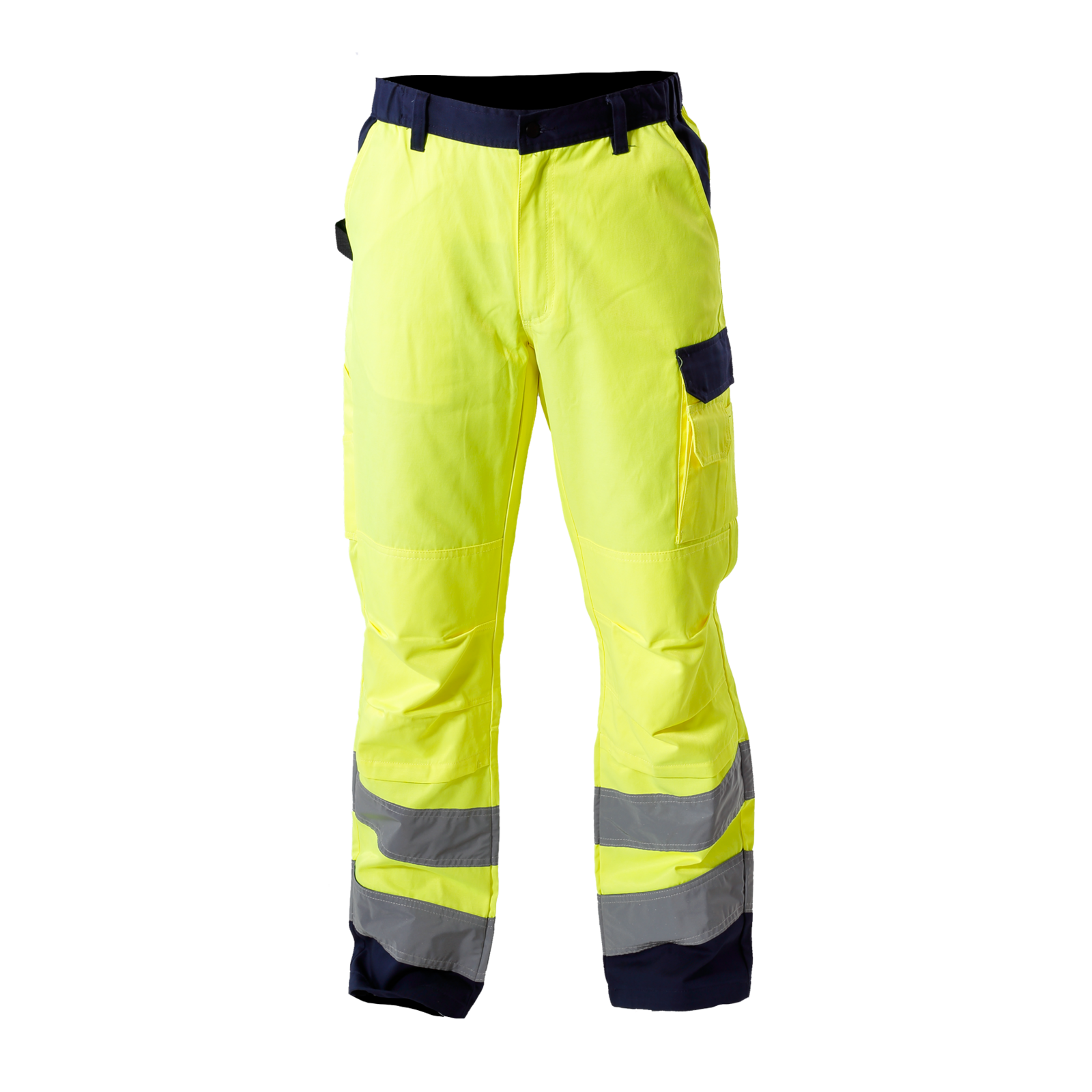 - Reflektierende Streifen gemäß EN ISO 20471. Sichtbarkeitsklasse: Klasse 2. Doppelte Nähte. Verstellbarer Bund mit Kordelzug. Gürtelschlaufen. Wasserabweisendes Material. 10 Taschen, davon 4 mit Klettverschluss. Knieschonertaschen mit Klettverschluss. Hammerschlaufe. Ausweisfach.
