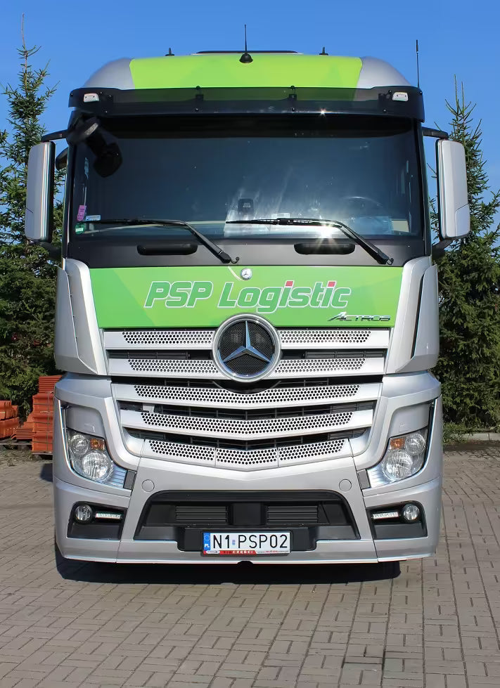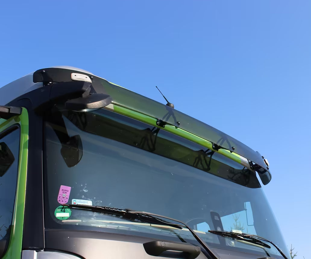 Osłona dedykowana jest do montażu na przedniej szybie Mercedes-Benz Actros MP4 i MP5 z kabiną StreamSpace oraz Mercedes-Benz Arocs z kabiną StreamSpace o długości 2500 mm. Idealna dla kierowców ciężarówek poszukujących efektywnej ochrony przed słońcem bez utraty widoczności. Zestaw montażowy dostępny jest osobnie.