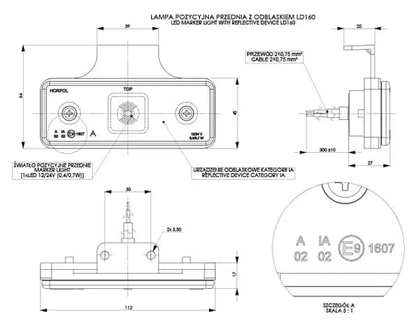 Model LD 160 wyposażony jest w praktyczny wieszak z mocowaniem za lampą, który umożliwia szybki i stabilny montaż. Dzięki technologii LED lampa charakteryzuje się niskim poborem energii oraz długą żywotnością. Zastosowanie jednej wydajnej diody LED zapewnia wyraźne przednie światło pozycyjne, poprawiające oznaczenie pojazdu.