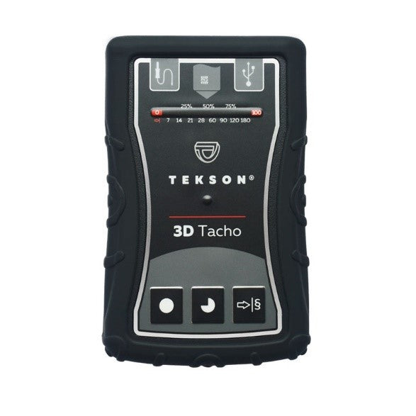 Das 3D-Tachogerät dient zum Herunterladen von Daten von Fahrerkarten und digitalen Fahrtenschreibern, einschließlich neuer Karten und intelligenter Fahrtenschreiber. Das TEKSON 3D-Tachogerät gewährleistet die Einhaltung gesetzlicher Vorgaben zur Datenerfassung und -archivierung und kann von Transportunternehmen und allen Aufsichtsbehörden, wie z. B. Grenzschutz, Zoll und der Bundesstraßenverwaltung (BAG), eingesetzt werden. Funktionen und Merkmale des 3D-Tachogeräts: • Kompatibel mit digitalen und SMART-Fahrtenschreibern, • 8 GB interner Speicher (bis zu 160.000 Messwerte von der Treiberkarte oder bis zu 20.000 Messwerte vom digitalen Fahrtenschreiber), • eingebauter Kartenleser, • Möglichkeit zur Konfiguration von drei Daten-Download-Modi, die mit 1,5-V-AA-Batterien (im Lieferumfang enthalten) betrieben werden. • widerstandsfähiges Gehäuse, • Möglichkeit, „spezielle“ Daten vom Fahrtenschreiber herunterzuladen, • Benachrichtigung über den Fortschritt des Daten-Downloads auf dem Gerätegehäuse sichtbar, • hohe Datenübertragungsgeschwindigkeit, • Batteriebetrieben, über einen Fahrtenschreiber oder USB-Anschluss. Packungsinhalt: • 3D-Tacho, • 2 x AA 1,5V Batterien, • USB-Kabel zum Anschluss an einen Computer, • Kabel zum Anschluss des Fahrtenschreibers, • schwarze Silikon-Schutzhülle • Kurzanleitung. Darüber hinaus enthält der Speicher des Geräts Folgendes: • Anweisungen, • Konfigurationssoftware.