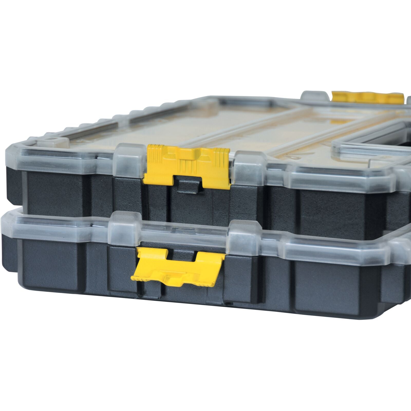 Der STANLEY FATMAX PRO Organizer (hoch, mit Kunststoffverschlüssen) ist eine robuste Lösung zur Aufbewahrung von Kleinteilen und Servicezubehör. Dank verschiebbarer Trennwände lässt sich die Inneneinteilung individuell an Ihre Bedürfnisse anpassen. Der transparente, bruchsichere Deckel und der dichte Verschluss jedes Fachs verhindern, dass sich der Inhalt vermischt. Die Konstruktion zeichnet sich durch stabile Scharniere, einen robusten Griff und ein sicheres Schloss aus. Der Organizer ist modular mit anderen Artikeln der Fatmax Pro Serie kombinierbar . Die Lieferung erfolgt leer.