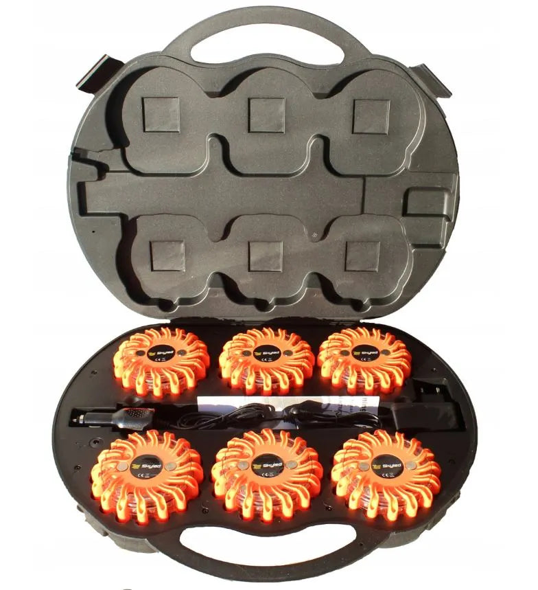 Das Set umfasst sechs kompakte Blitzleuchten, die problemlos in einen Kofferraum, eine Notfalltasche oder ein Handschuhfach passen. Ihr leuchtend oranges Gehäuse erhöht die Sichtbarkeit auch tagsüber, und ihre intuitive Bedienung ermöglicht eine schnelle und einfache Anwendung.