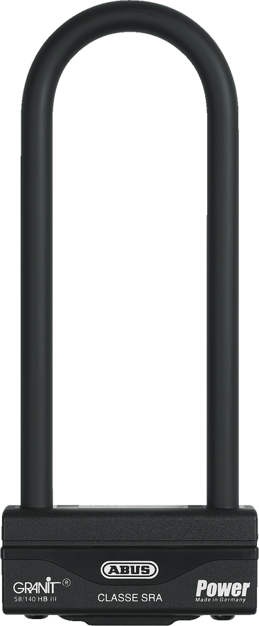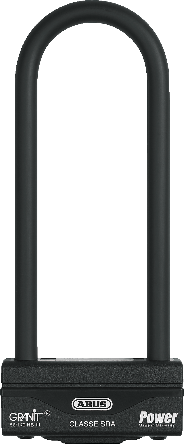 This 18-mm U-Lock is classified as ABUS GLOBAL PROTECTION STANDARD® Security Level 18. With the GRANIT™ Power 58 lock, the shackle locks into the lock body twice. Specially hardened steel is bonded to a counter-piece made of the same material, leaving thieves no chance.