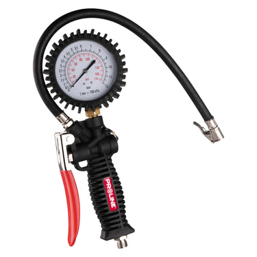 The Proline Premium Inflating Gun with Pressure Gauge is a tool designed for tire repair shops and professional service centers. Equipped with a large Ø80 mm pressure gauge with a clear scale and a 440 mm rubber hose, it ensures ease of use and precise pressure readings. Its robust aluminum alloy construction guarantees durability, and a maximum permissible operating pressure of up to 8 bar allows for a wide range of applications. The standard 1/4" connection ensures compatibility with pneumatic systems; the product is CE-certified.