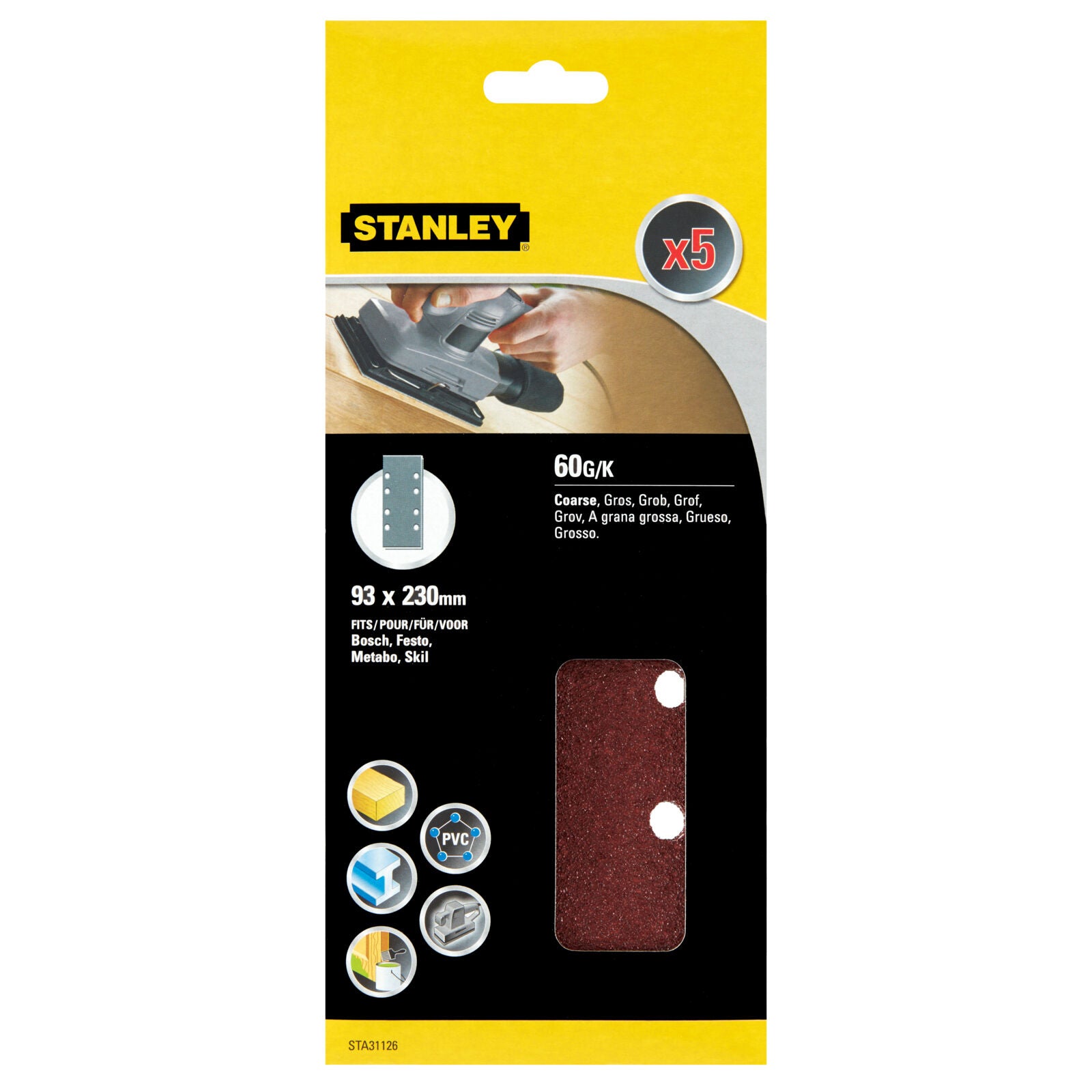 Stanley sandpaper (sheet 93x230 mm, 8 holes, 60 grit) – durable third-sheet sheets designed for aggressive sanding and rapid material removal. The punched (perforated) hole pattern allows for efficient dust extraction during use, improving comfort and extending the life of the abrasive. The sheets are compatible with third-sheet sanders (including Bosch, Festo, Metabo, Skil) and are sold in convenient 5-sheet packs – ready for quick replacement during workshop use.