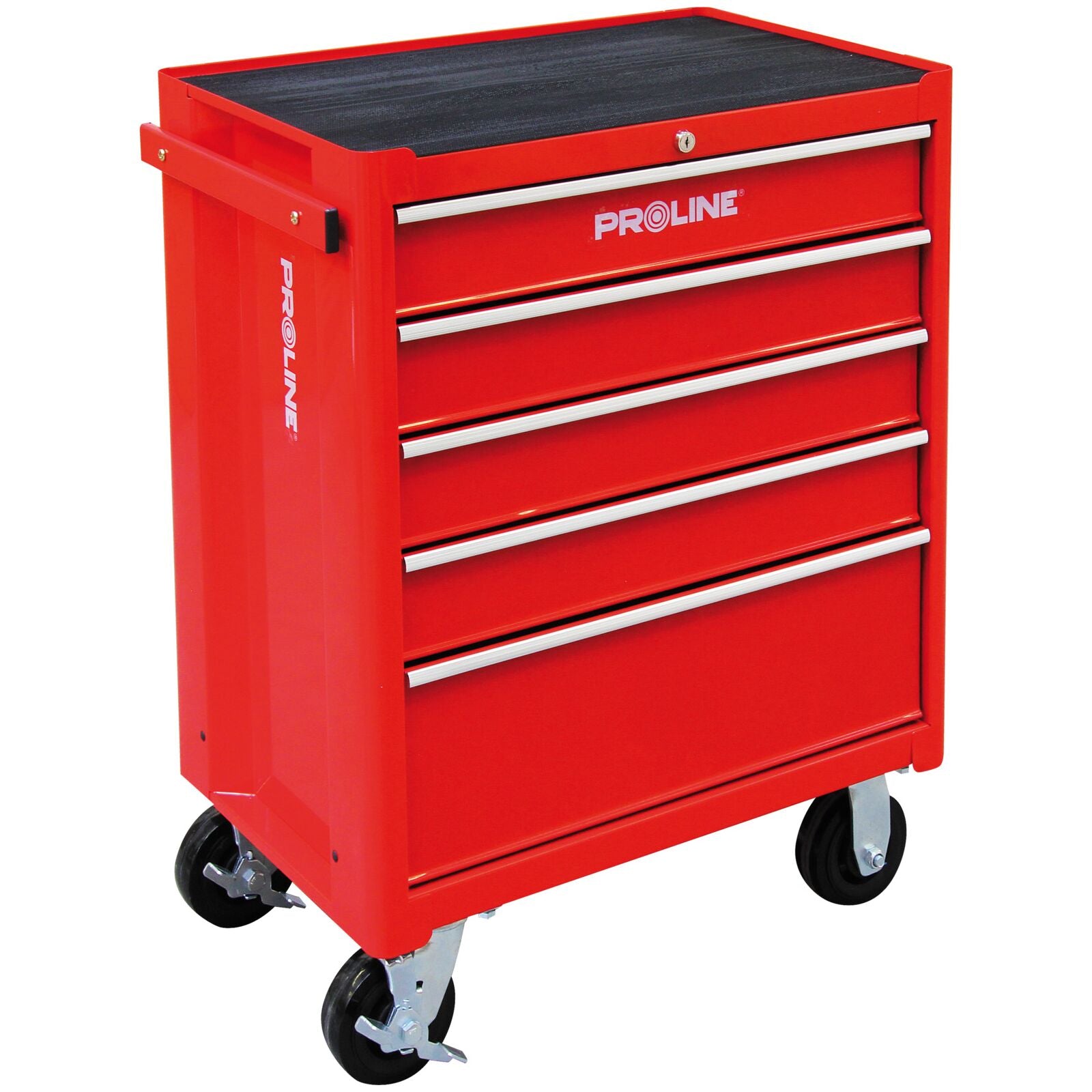 The PROLINE 5-Drawer Tool Cabinet (688 x 458 x 735 mm) is a practical and mobile unit for organized tool storage in the workshop and service center. Spacious, smoothly sliding drawers facilitate access to accessories, and a central locking system secures contents with a single turn of a key. Ball-bearing wheels with dual brakes ensure stability and ease of movement. Sturdy ball-bearing slides and a well-thought-out tabletop organizer make this cabinet a practical workstation.