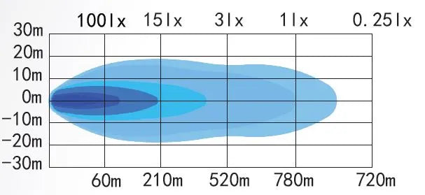 - Light range: 780m (1 lux) ECE