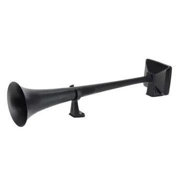 A durable, round air horn made of aluminum with a matte black finish. Designed by the renowned HADLEY brand, this product is intended for installation in vehicles equipped with an air suspension system. This brand's horns are known for their distinctive sound and unique appearance, earning them recognition in many countries. A mounting bracket is included in the kit.