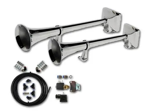 This set of two HADLEY air horns combines timeless design, reliable technology, and legendary sound. Crafted from high-quality chrome-plated stainless steel , the 48 and 56 cm long horns offer exceptional durability and a striking, polished appearance that complements any commercial vehicle.