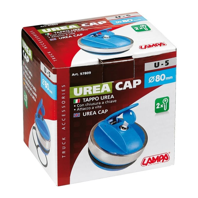 The U-5 80 mm AdBlue filler cap is a model with a security lock, designed for bayonet-mounted AdBlue tanks. It provides a tight seal and protects against unauthorized access to the tank. It is ideal for heavy-duty vehicles where AdBlue system safety and filler cleanliness are essential.