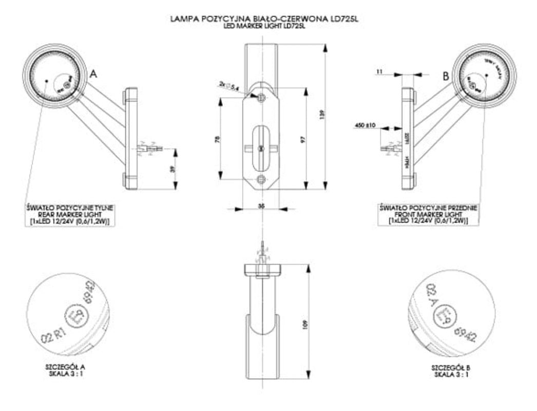 The LD 725/L white and red LED marker lamp is a modern lighting solution that provides excellent visibility for your vehicle from the front and rear, significantly increasing road safety. Mounted on a short, angled arm , the lamp offers easy installation, while LED technology guarantees energy efficiency and a long service life.