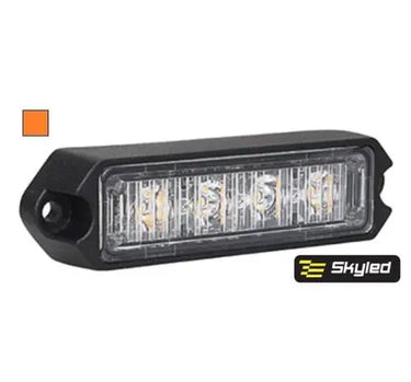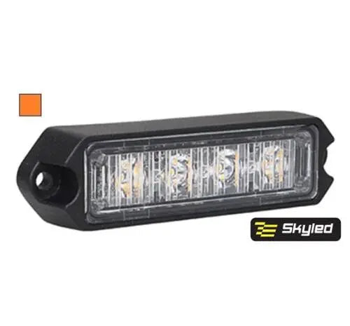 The SKYLED warning light measures 28x104.5 mm and features an orange LED strobe light. The product meets R10, R65, and SAE homologation requirements, allowing for legal use on vehicles.