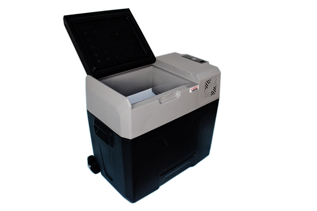 The Vigo Cool 40L portable refrigerator combines efficiency, mobility, and modern features. Equipped with wheels and a retractable handle, it ensures comfort on every trip.