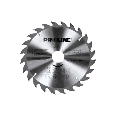 PROLINE Circular Saw for Wood - 60 teeth, 30 mm mounting hole. High-quality carbide blades and a hardening and tempering process ensure long life and a clean cut. Designed for cutting wood and wood-based materials; the saw mounts on spindles up to 250 mm in diameter and comes with a reduction ring. Packaged in a cardboard box with a hanger - ready for display.