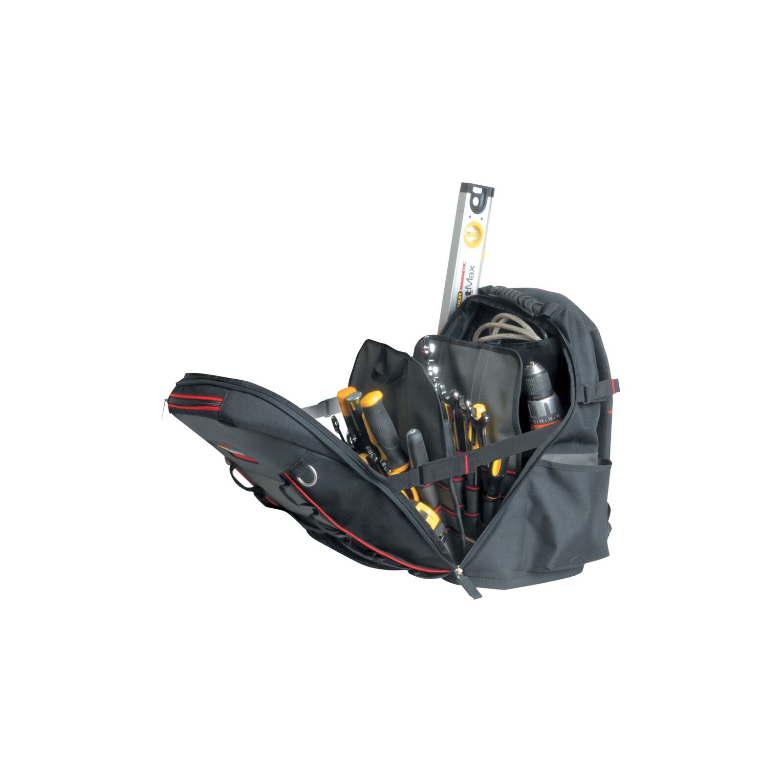 The STANLEY FATMAX Tool Backpack is a durable and functional solution for professionals who need mobile tool storage. Made of strong 600 x 600 Denier nylon, it resists abrasion and heavy use. It features a movable interior divider with multiple pockets and a fully opening design for quick access to tools. An additional compartment can accommodate a power tool or laptop. A waterproof plastic base protects contents from dirt and moisture, while breathable padding on the back and shoulder straps enhances comfort.
