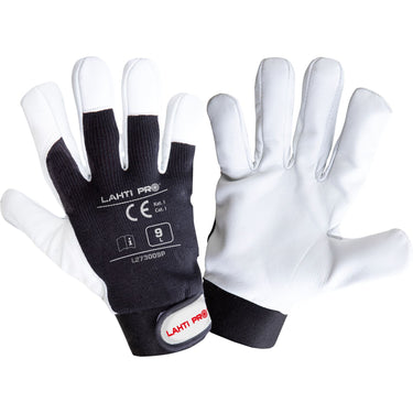 - The grip section is made from a single piece of leather for increased durability. An elastic cuff with a hook-and-loop closure ensures comfort.