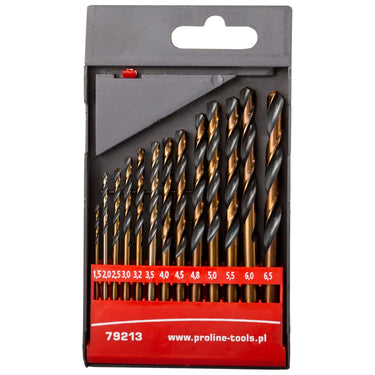 PROLINE HSS DIN338 drill bit set - a 13-piece set (Ø 1.5–6.5 mm) designed for precision drilling in metal. Fully ground edges ensure excellent sharpness and durability, while a 135° point angle with chisel correction facilitates centering and reduces centering time. Made of refined high-speed steel, resistant to torsional stress, this practical and durable set is suitable for workshop and professional use.