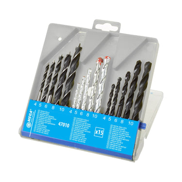 MEGA drill bit set – a 15-piece set for concrete, wood, and metal (5 of each type) in popular sizes 4, 5, 6, 8, and 10 mm. It's a practical tool for both workshop and home: one set allows you to tackle most standard assembly and renovation jobs, from drilling holes in walls to assembling furniture. The cylindrical chuck ensures quick and secure mounting in the drill spindle, and the comprehensive range of sizes ensures versatile applications.