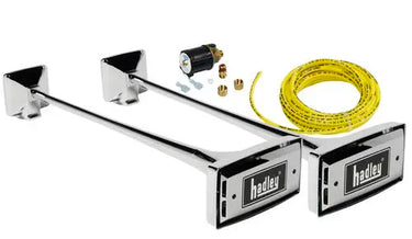 The HADLEY two-piece air horn kit is a professional solution for vehicles with air systems. Made of durable, chrome-plated steel , the horns offer a unique sound and elegant appearance. The kit includes a genuine HADLEY 12/24V solenoid valve for convenient horn control, and a full installation kit.