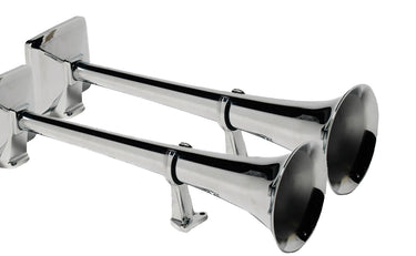 A two-piece set of round air horns made of chrome-plated stainless steel. Products from the renowned HADLEY brand, designed for vehicles equipped with air systems. Their distinctive appearance and unique sound make them a globally recognized brand. The set includes a complete mounting kit and a cord-activated valve.
