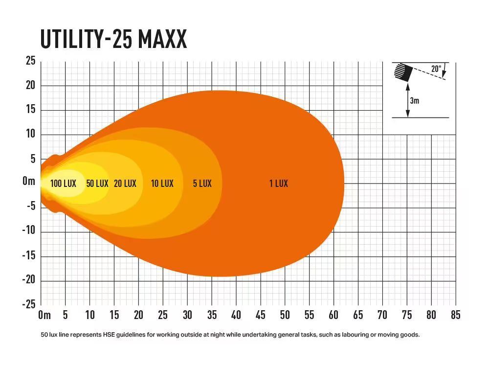 Lampa LAZER UTILITY-25 MAXX to uniwersalne rozwiązanie oświetleniowe dla profesjonalnych operacji nocnych. Idealna do ciężarówek, przyczep, maszyn budowlanych, pojazdów ratowniczych, sprzętu górniczego oraz każdego pojazdu wymagającego niezawodnego oświetlenia roboczego. Zaawansowany system chłodzenia Matrix i elektroniczne zarządzanie temperaturą gwarantują stabilną pracę przez wiele godzin bez przegrzewania. Klasyfikacja IP69K oznacza pełną odporność na warunki ekstremalne — od intensywnych opadów śniegu i deszczu po pracę w pyle i zanieczyszczeniach przemysłowych. Lampa sprawdza się zarówno w logistyce, budownictwie, jak i w systemach ratunkowych i ochrony.