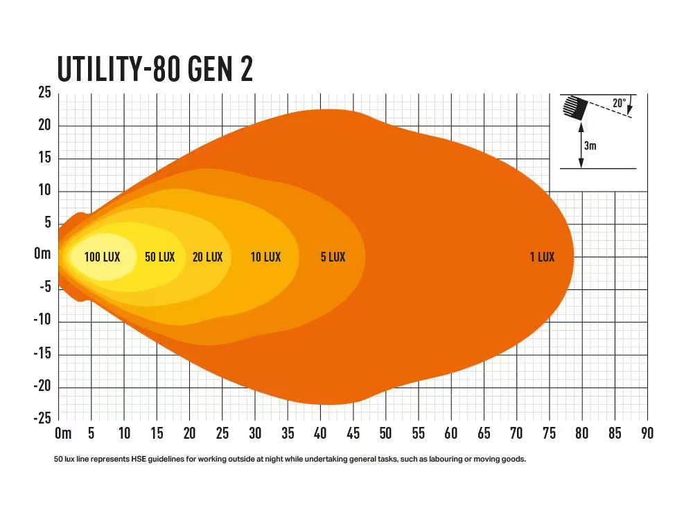 Lampa UTILITY-80 Gen2 jest przeznaczona do montażu na ciężarówkach, maszynach kopalnicznych, urządzeniach budowlanych i pojazdach specjalistycznych. Szeroki wspornik montażowy zapewnia stabilną i elastyczną instalację. Sprawdza się doskonale w pracach nocnych na dużych obszarach, gdzie wymagane jest wysokie oświetlenie. Standard HSE 50 luksów jest osiągany na odległości 19 metrów, co czyni ją idealnym rozwiązaniem dla operacji wymagających wyjątkowej widoczności i bezpieczeństwa pracy.