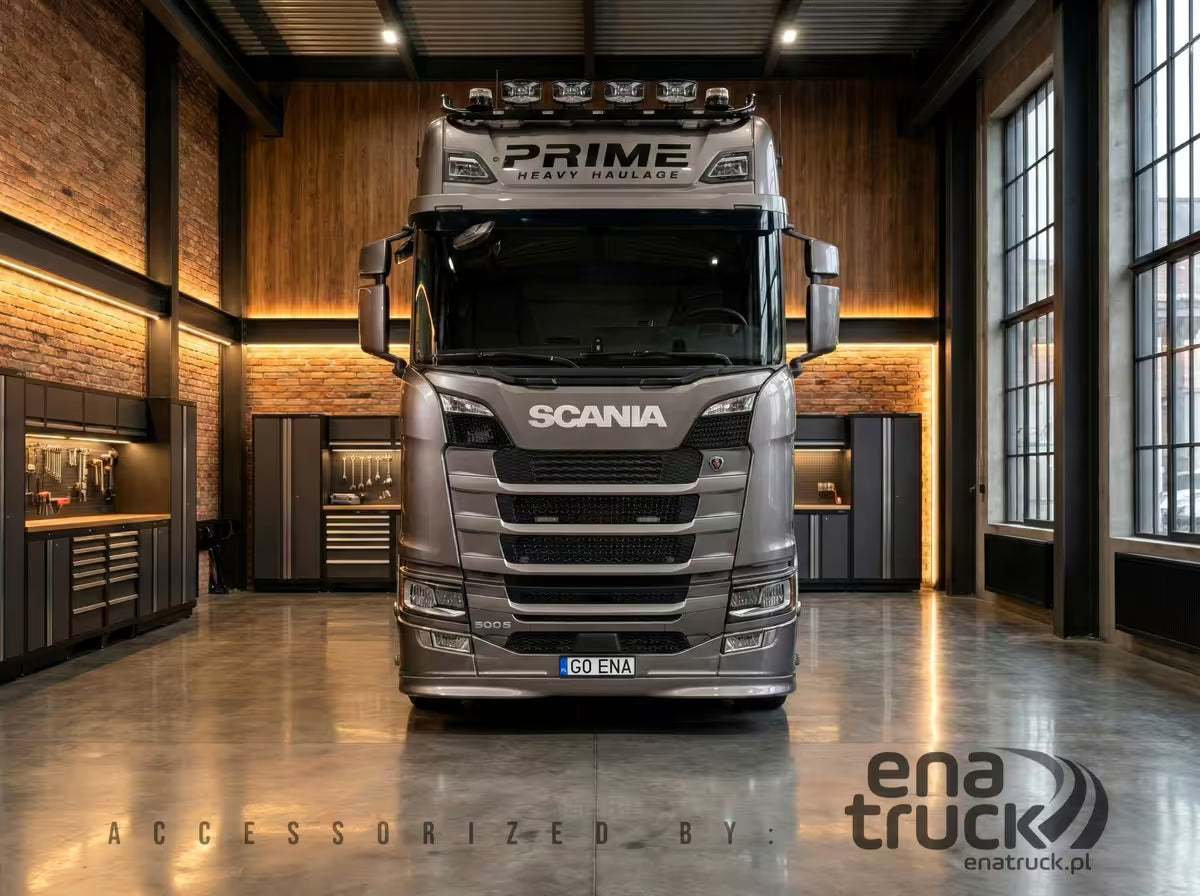Spoiler pod wysoki zderzak firmy TruckKing to specjalistyczne wyposażenie aerodynamiczne dedykowane nowoczesnym ciężarówkom Scania NG. Produkt wykonany z wysokiej jakości laminatu zapewnia gładką, estetyczną powierzchnię idealną do lakierowania. Spoiler o wysokości 13 cm projektowany jest specjalnie dla pojazdów wyposażonych w wysoki zderzak, pomagając w zmniejszeniu oporów aerodynamicznych i poprawie efektywności paliwowej. Doskonałe wykonanie i precyzyjny fit gwarantują profesjonalny wygląd pojazdu po montażu oraz długotrwałą trwałość w warunkach transportowych.