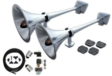 Profesjonalny zestaw sygnałów pneumatycznych marki HADLEY to rozwiązanie stworzone z myślą o kierowcach i właścicielach pojazdów ciężarowych, którzy cenią sobie niezawodność, siłę dźwięku i ponadczasową stylistykę. Dwa okrągłe sygnały wykonane z chromowanego mosiądzu o długości 62 cm zapewniają nie tylko charakterystyczne, donośne brzmienie, ale też efektowny wygląd, który doskonale komponuje się z linią pojazdu.